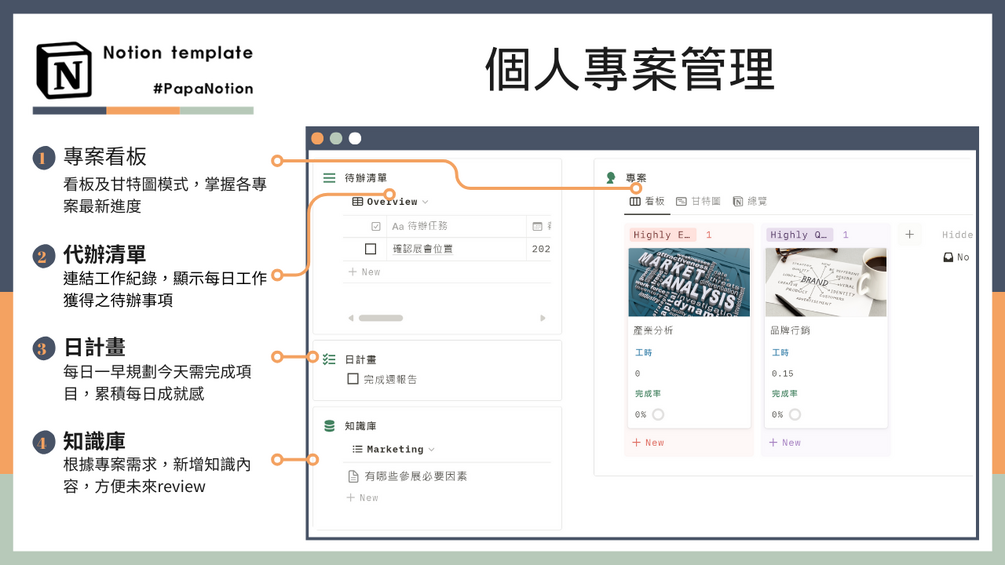 [個人專案管理] 可以幫助您系統性管理專案內容,以專案看板為主建立重要專案內容,並拆解成細部作業事項,追蹤專案進度與完成率。輔以日計畫,規劃每日工作內容,逐日累積成就感,讓計畫不間斷。工作紀錄連結待辦事項,讓你掌握每周工作及開會內容,成為你的第二大腦。