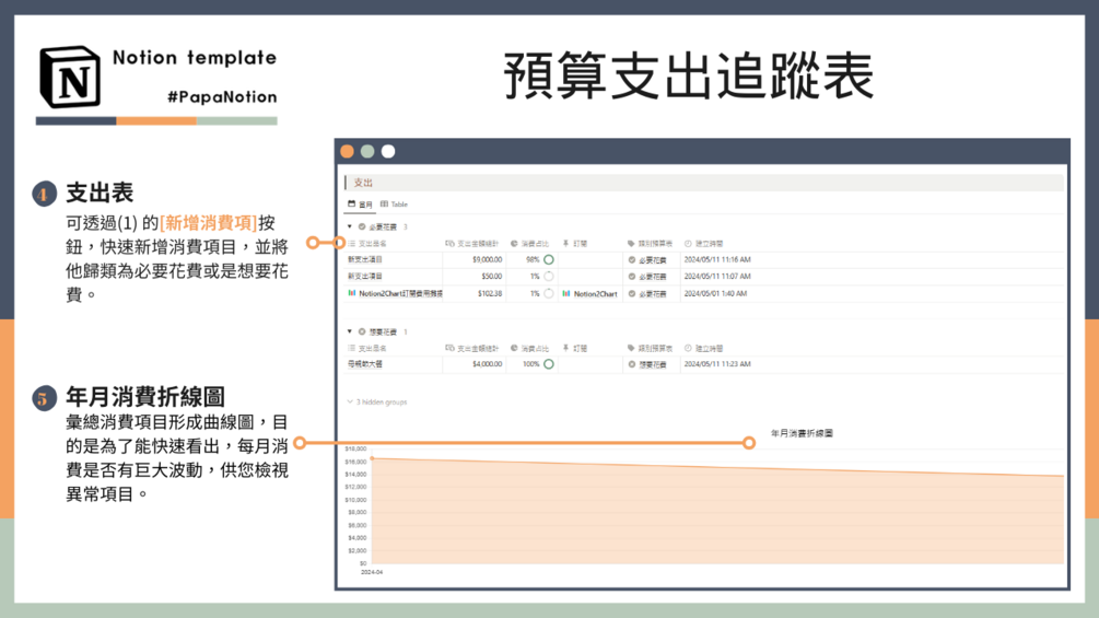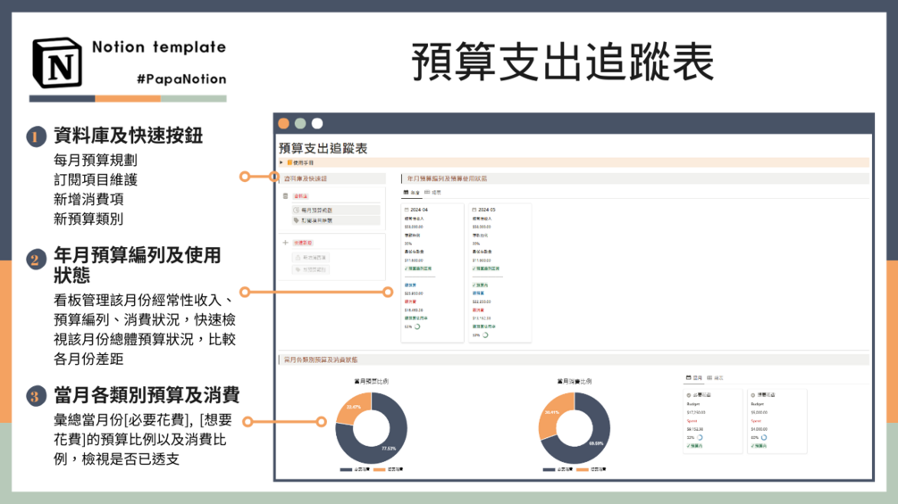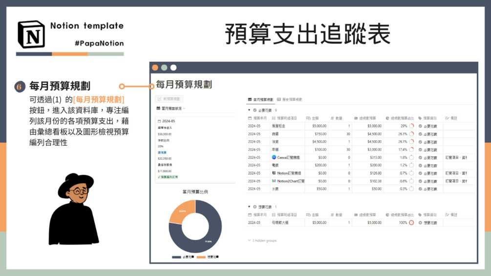 [預算支出追蹤表] 可以幫助您規劃每月的花費項目,檢視自己的消費習慣,若您經常性覺得自己花費透支、存不到錢,那非常適合使用該模板。若您有著F.I.R.E計畫,也非常適合使用該模板,掌控消費,掌控人生。